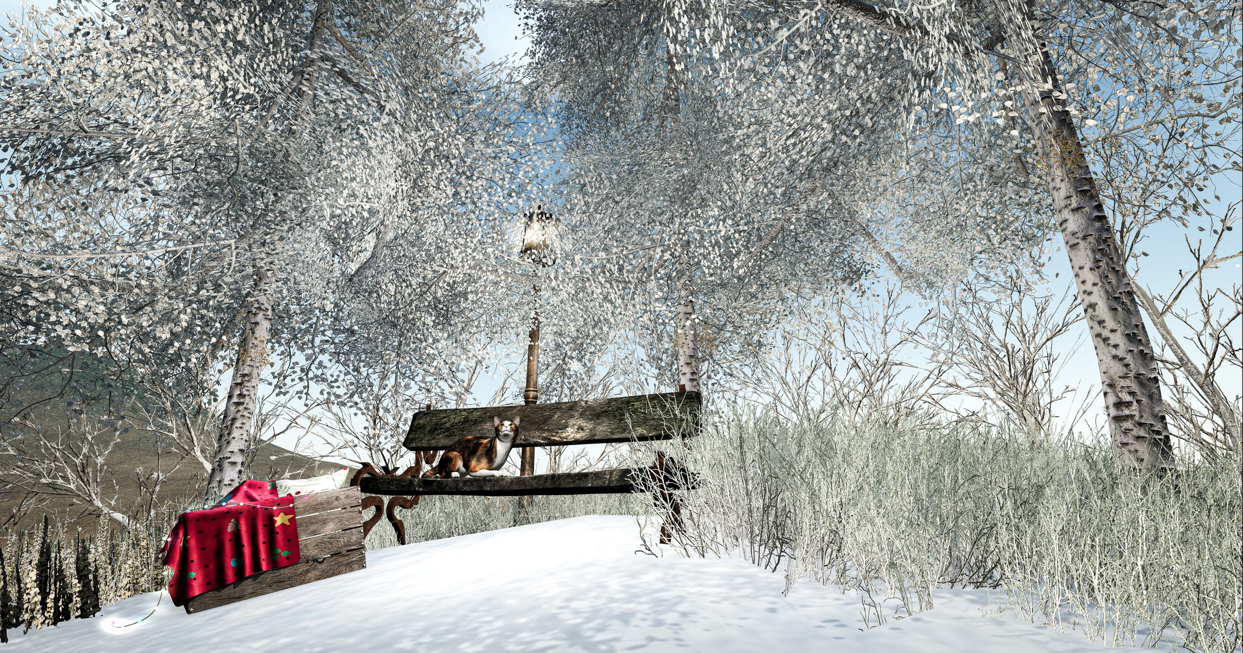 Only the lantern glows warmly in the quiet, and a red blanket left on the bench speaks of comfort. The cat remains, unbothered by the frost, watching faithfully over the place.