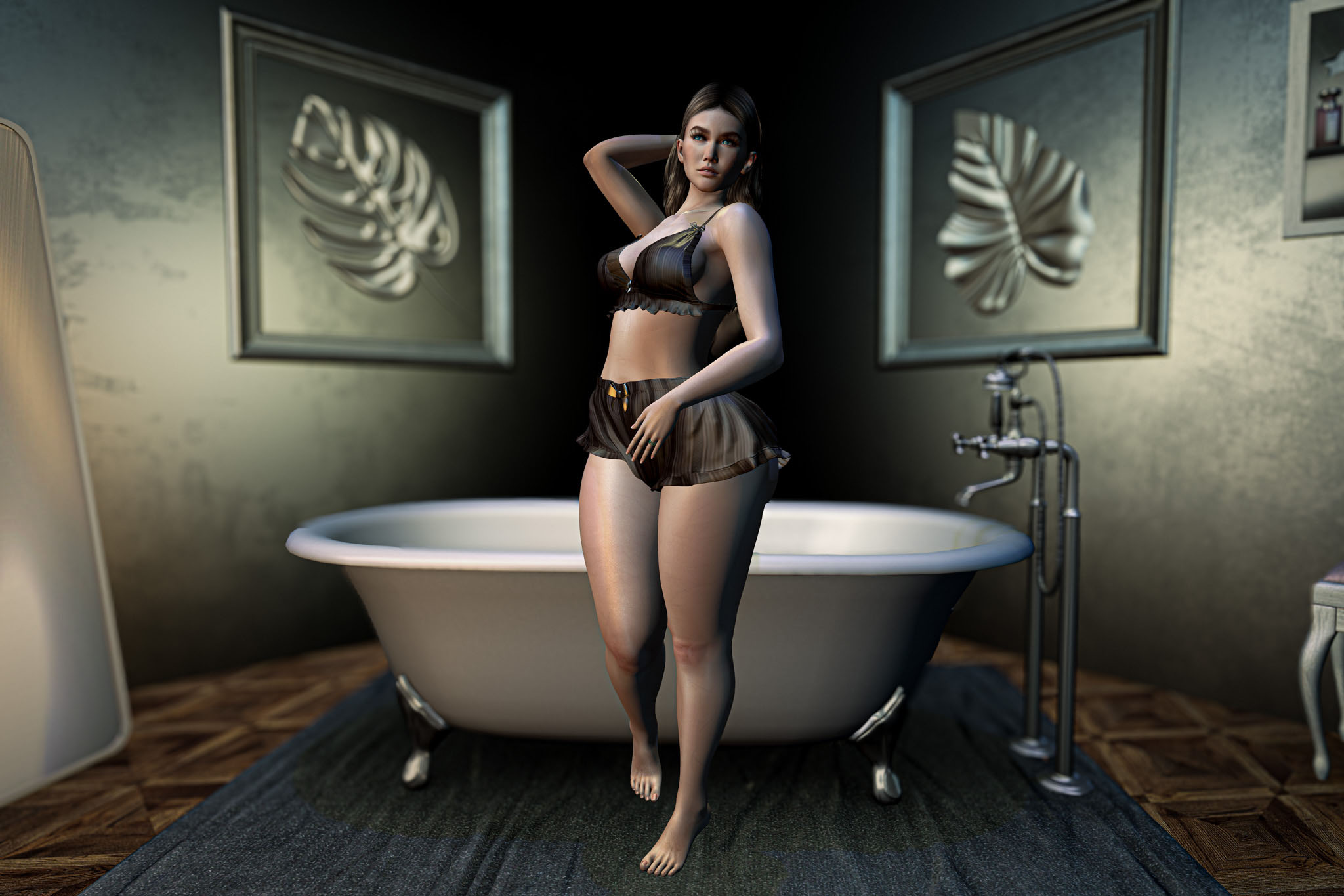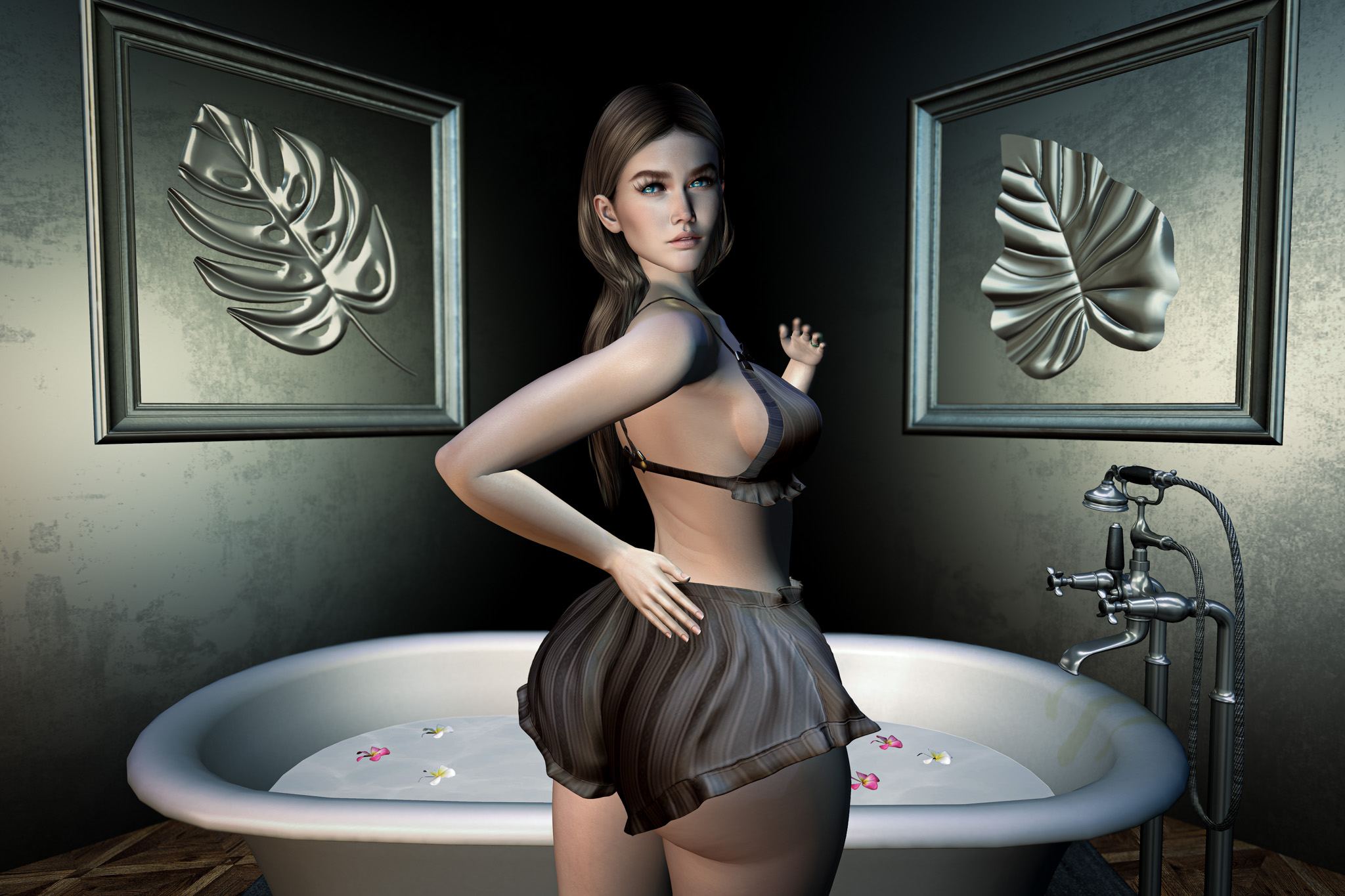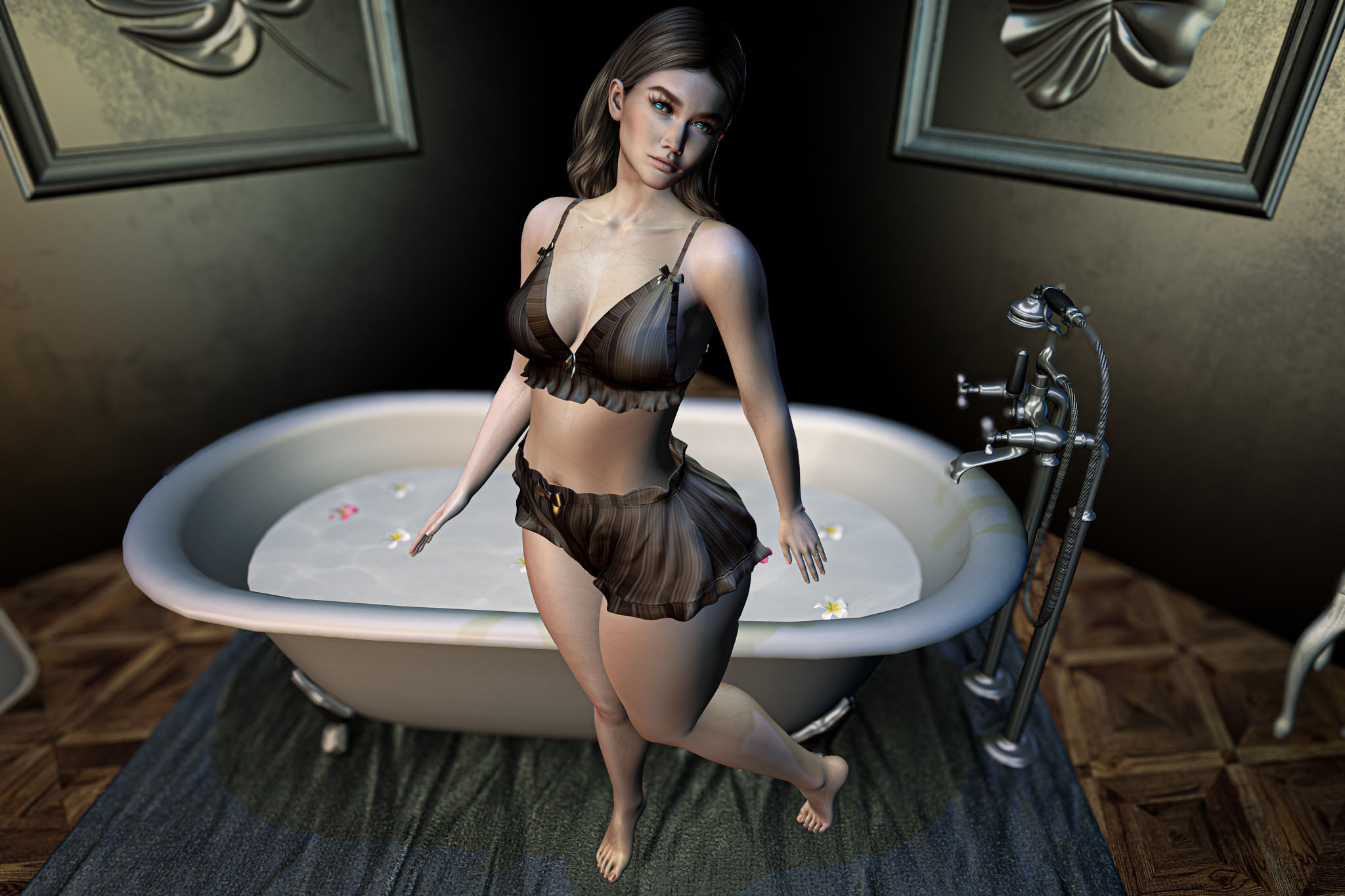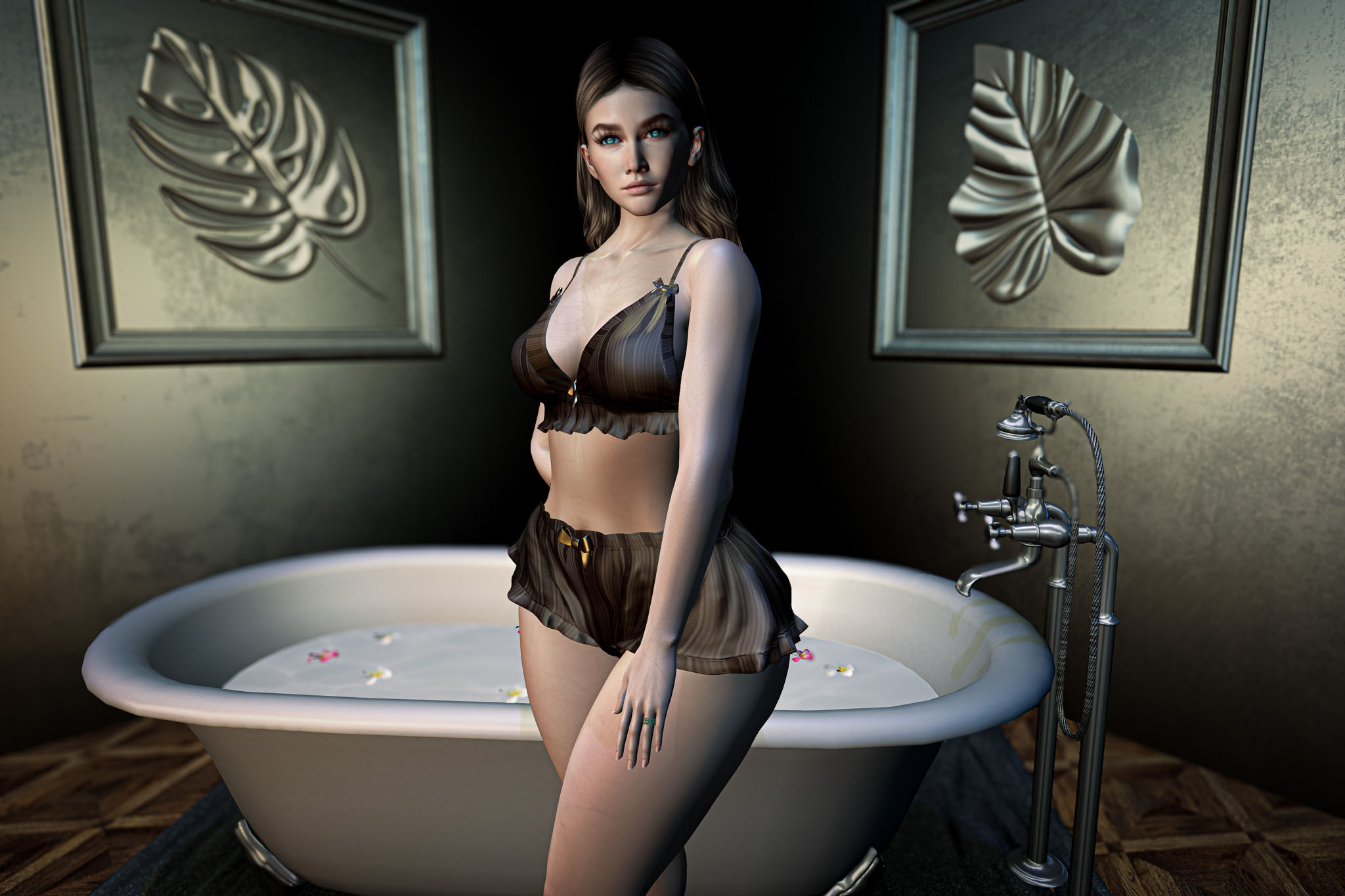 The water waits, still and quiet, with only a few petals drifting like thoughts that refuse to settle. The room is dim, softened by the glow of a single light, shadows folding into one another until they feel almost like an embrace.