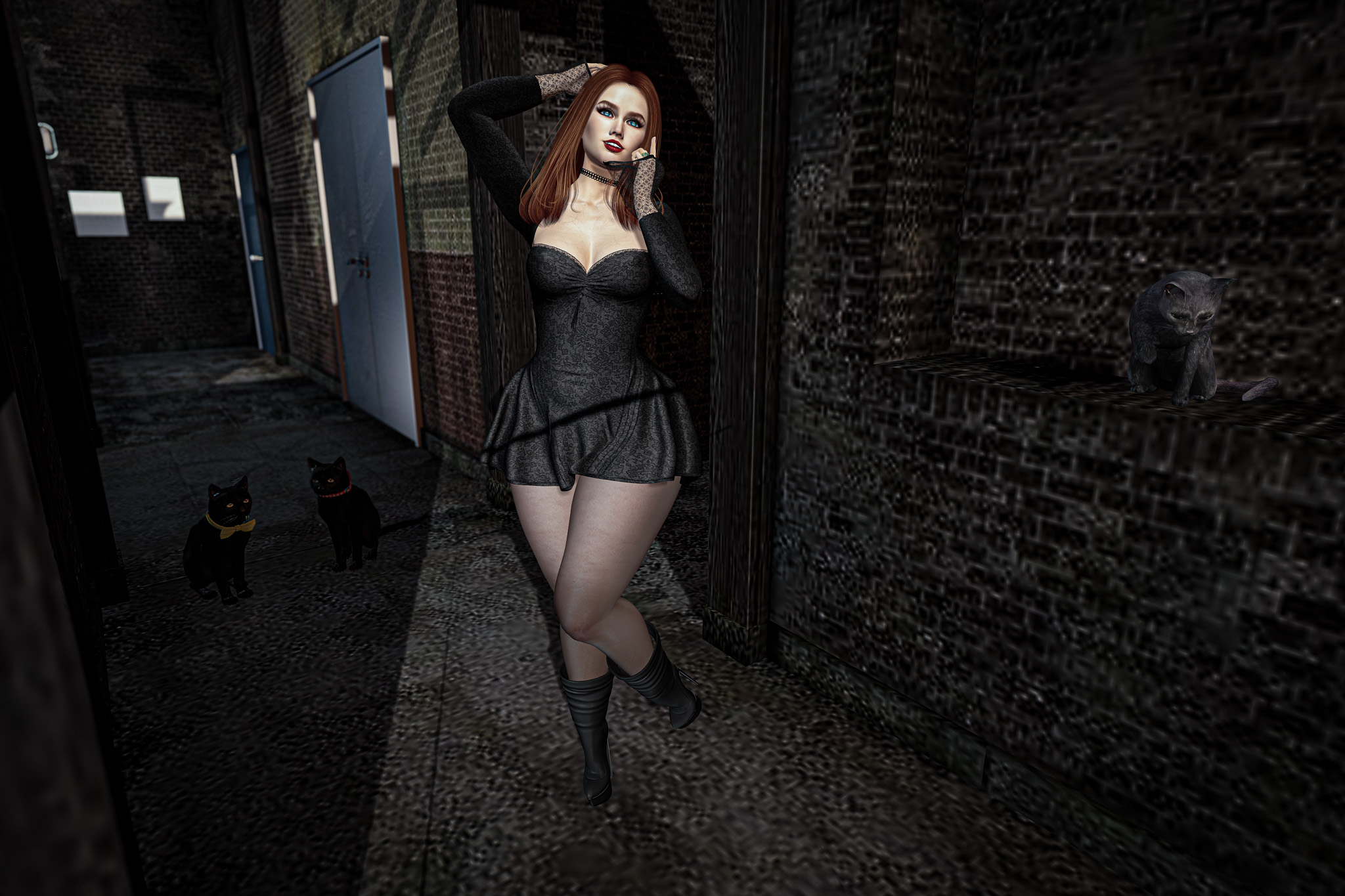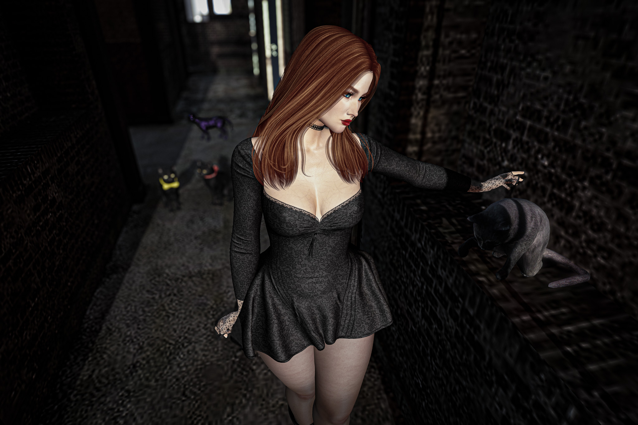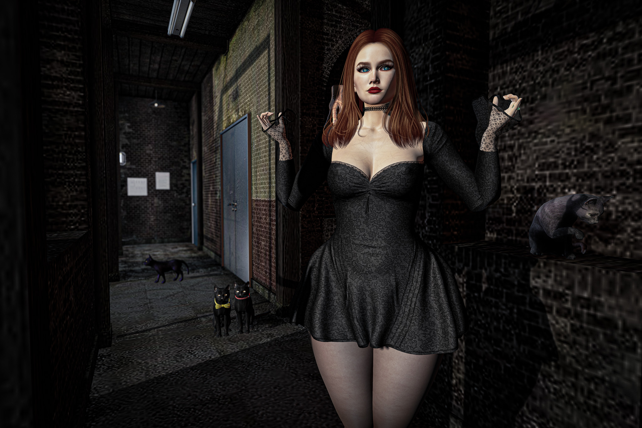 She moved with quiet confidence, as though she had been here before—perhaps in another life, perhaps only in dreams. The cats padded close behind, their glowing eyes reflecting a language older than words. They didn’t need to guard her; they simply belonged to her silence, as much as the space itself did.
