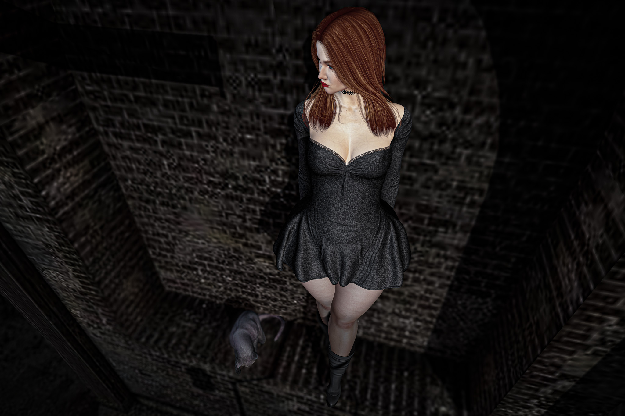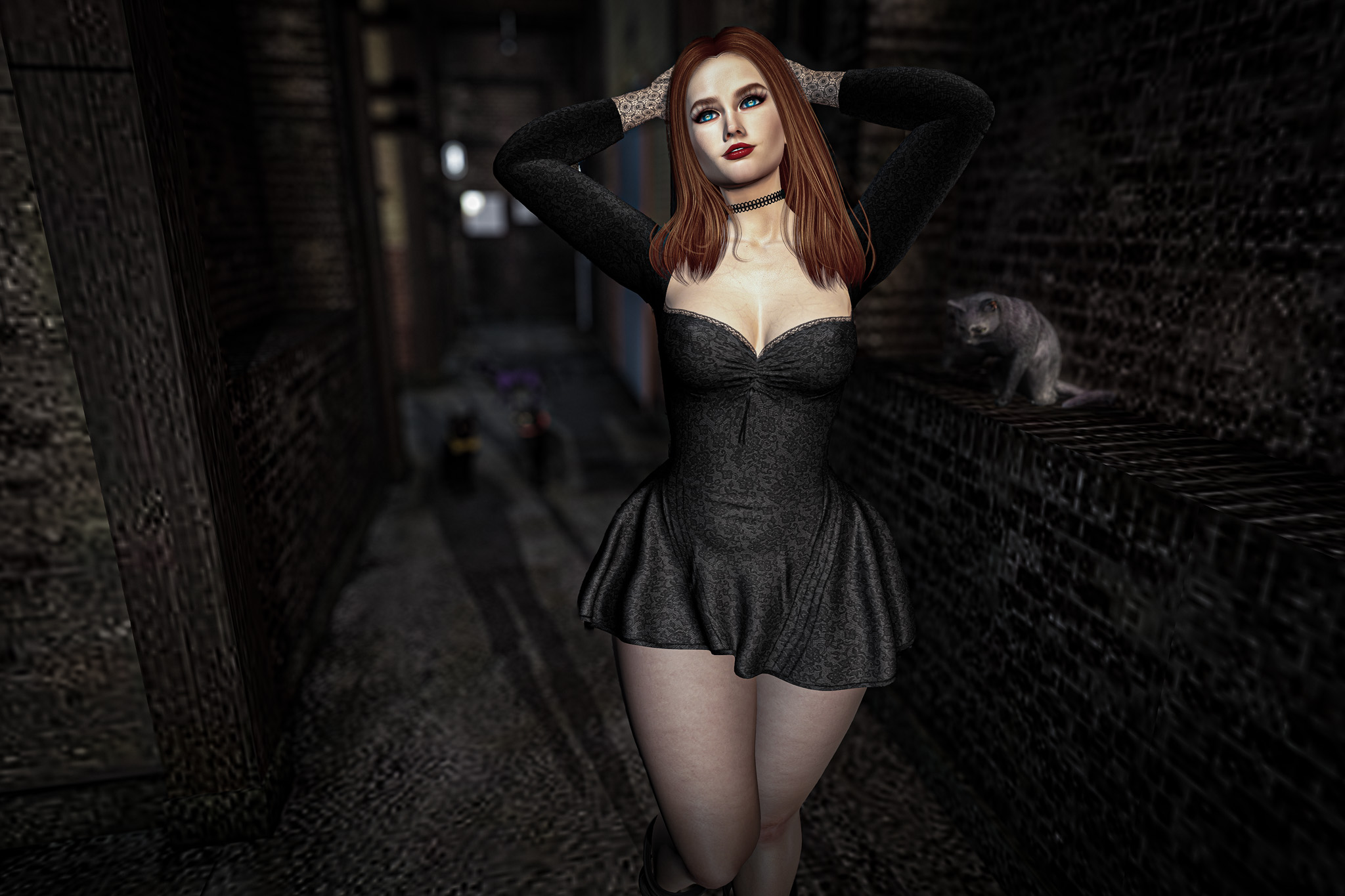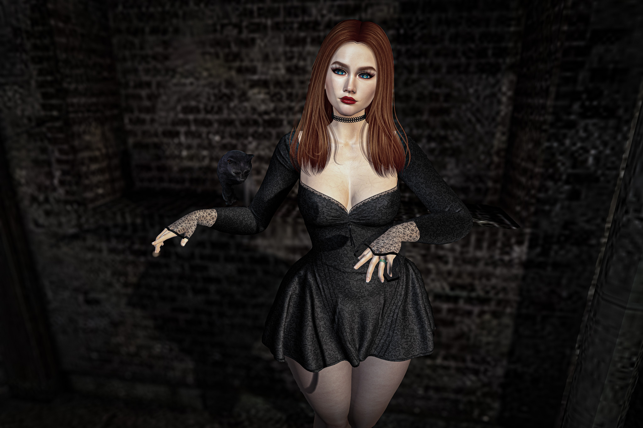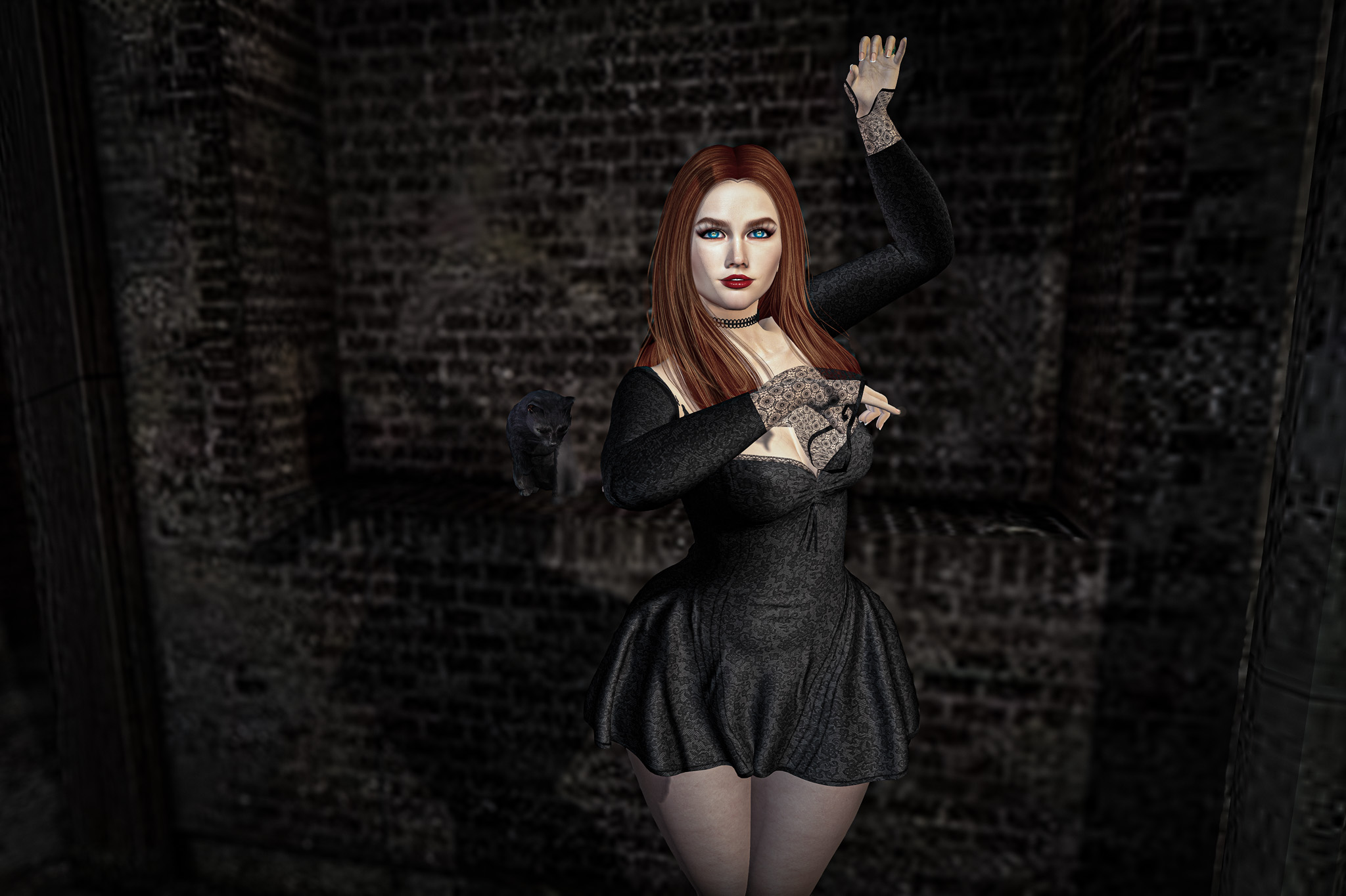 She moved with quiet confidence, as though she had been here before—perhaps in another life, perhaps only in dreams. The cats padded close behind, their glowing eyes reflecting a language older than words. They didn’t need to guard her; they simply belonged to her silence, as much as the space itself did.