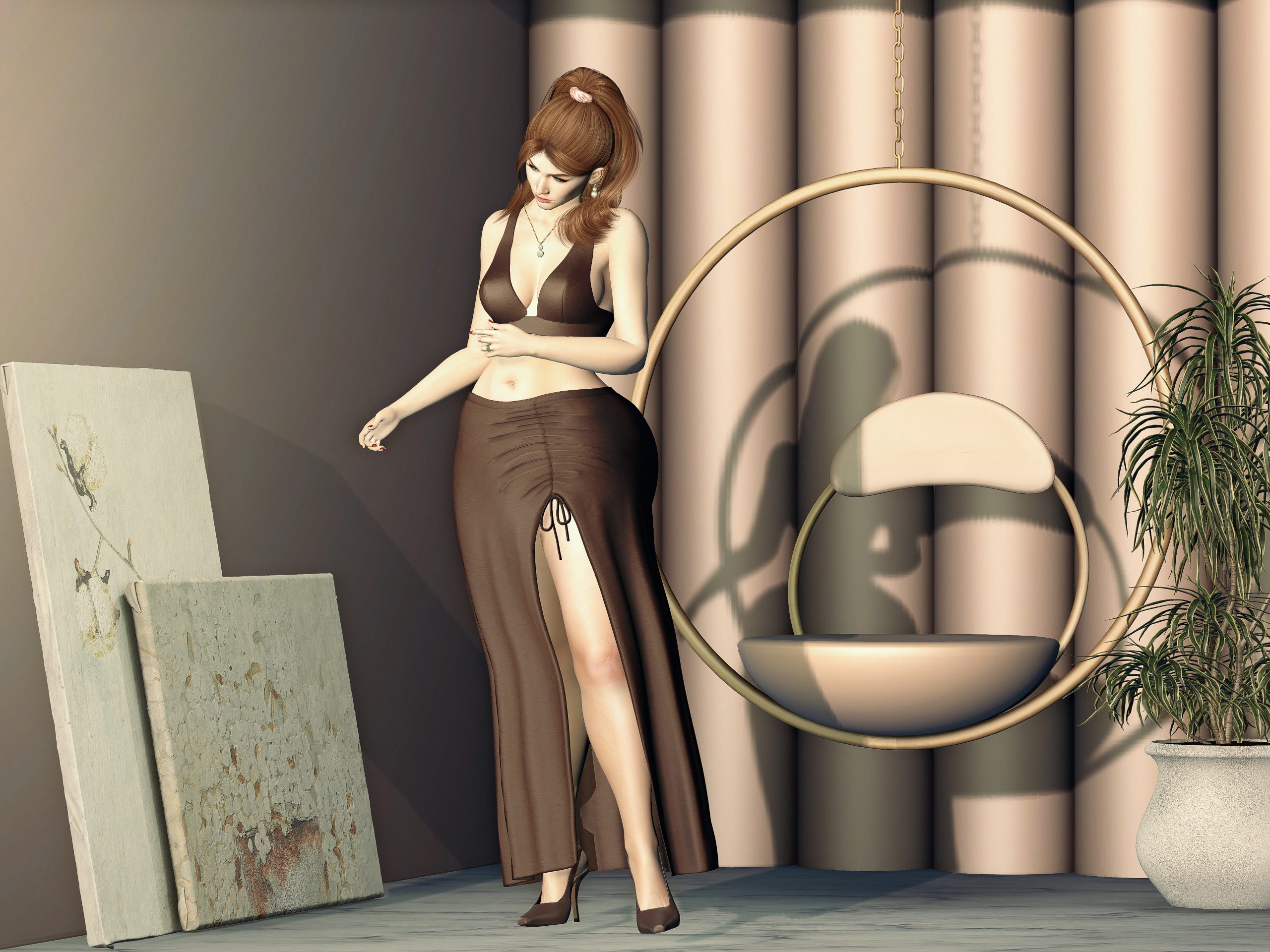 The afternoon light spreads across the room, drawing soft golden lines on walls and fabrics. She leans into the silence, her hand running over the curve of the chair, her gaze lost in thought. The calm colour of her skirt caught the sun like warm earth after rain, anchoring her in this moment, calm and serene.