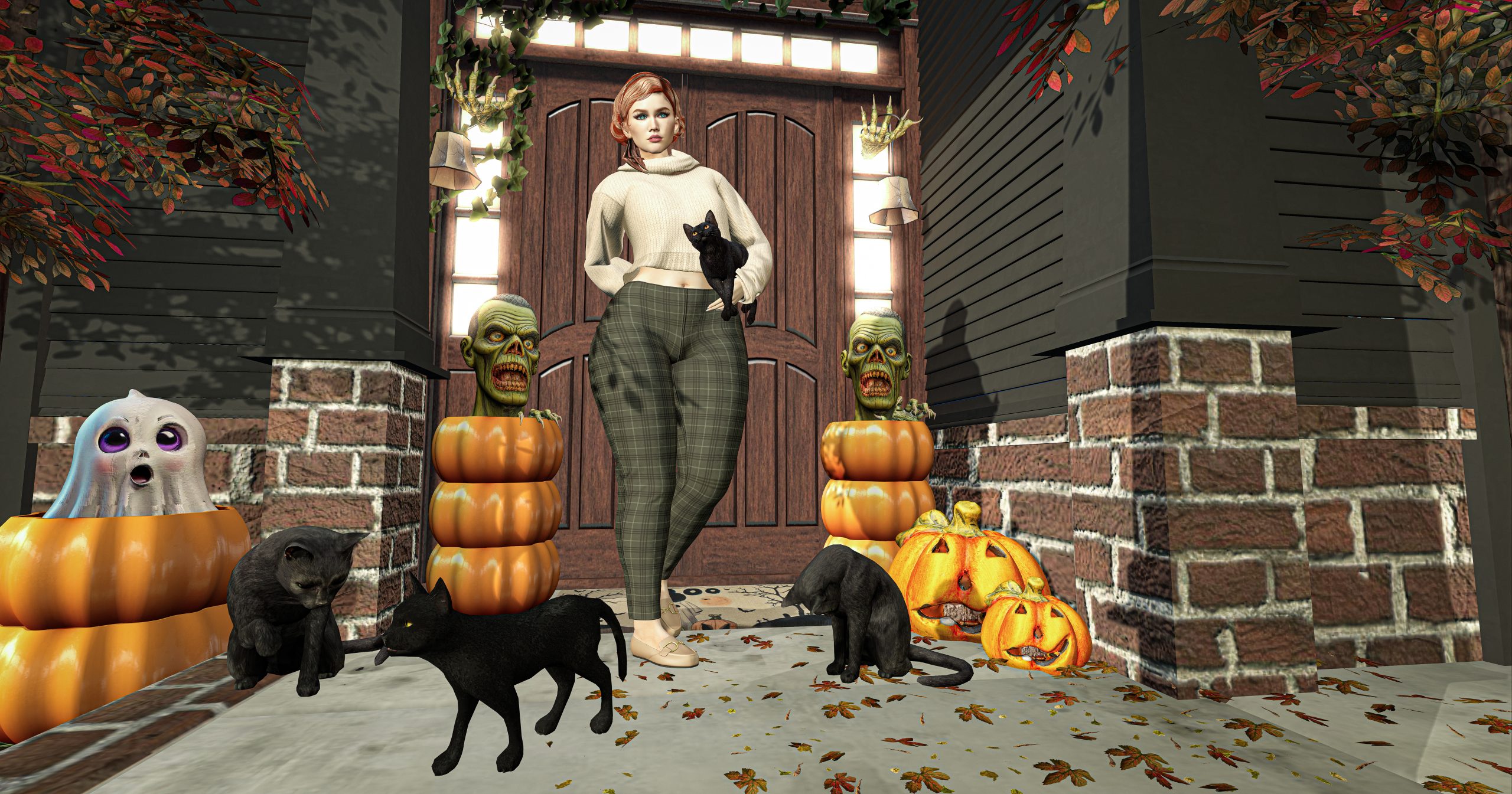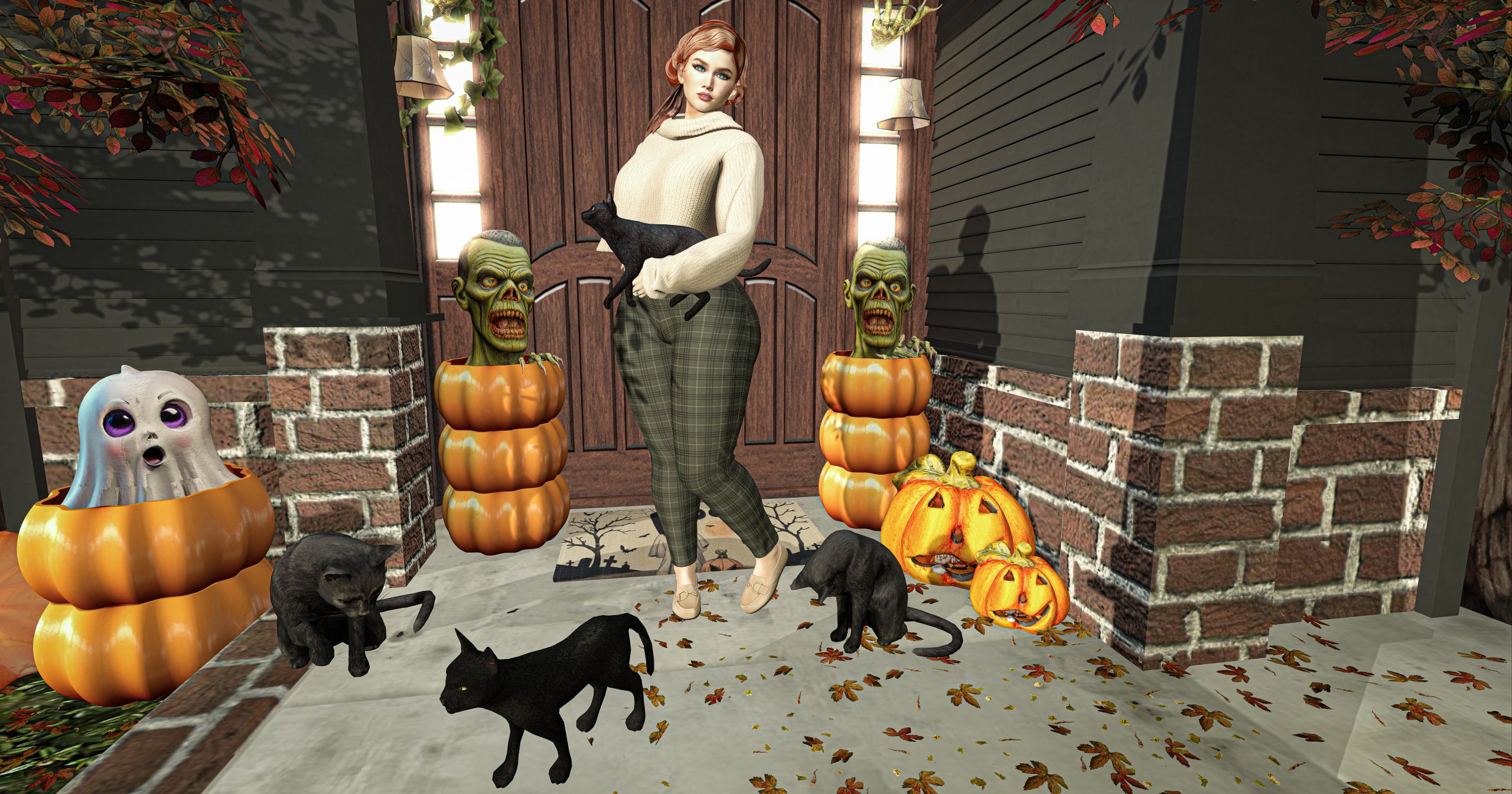 I had just stepped outside to check the pumpkins — soft light spilling through the porch lanterns, brushing against the bricks like an old memory. The cats were already there, gathering as if they knew something I didn’t. And when the smallest one pressed her paws against my chest, I held her close without thinking. Her warmth was a heartbeat against the cool October air.